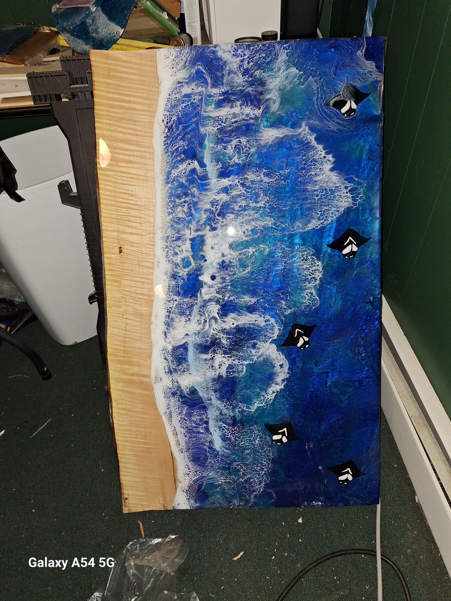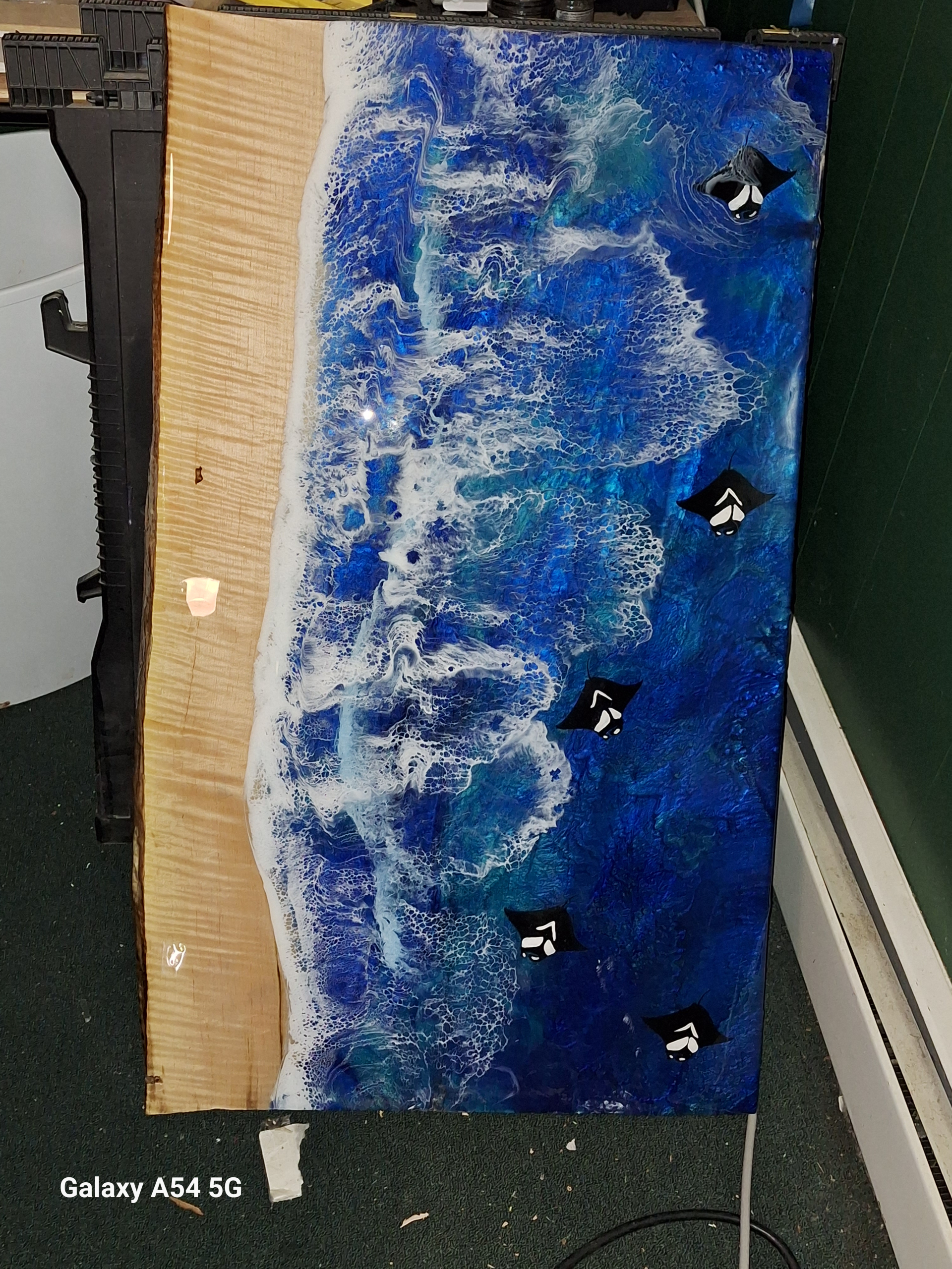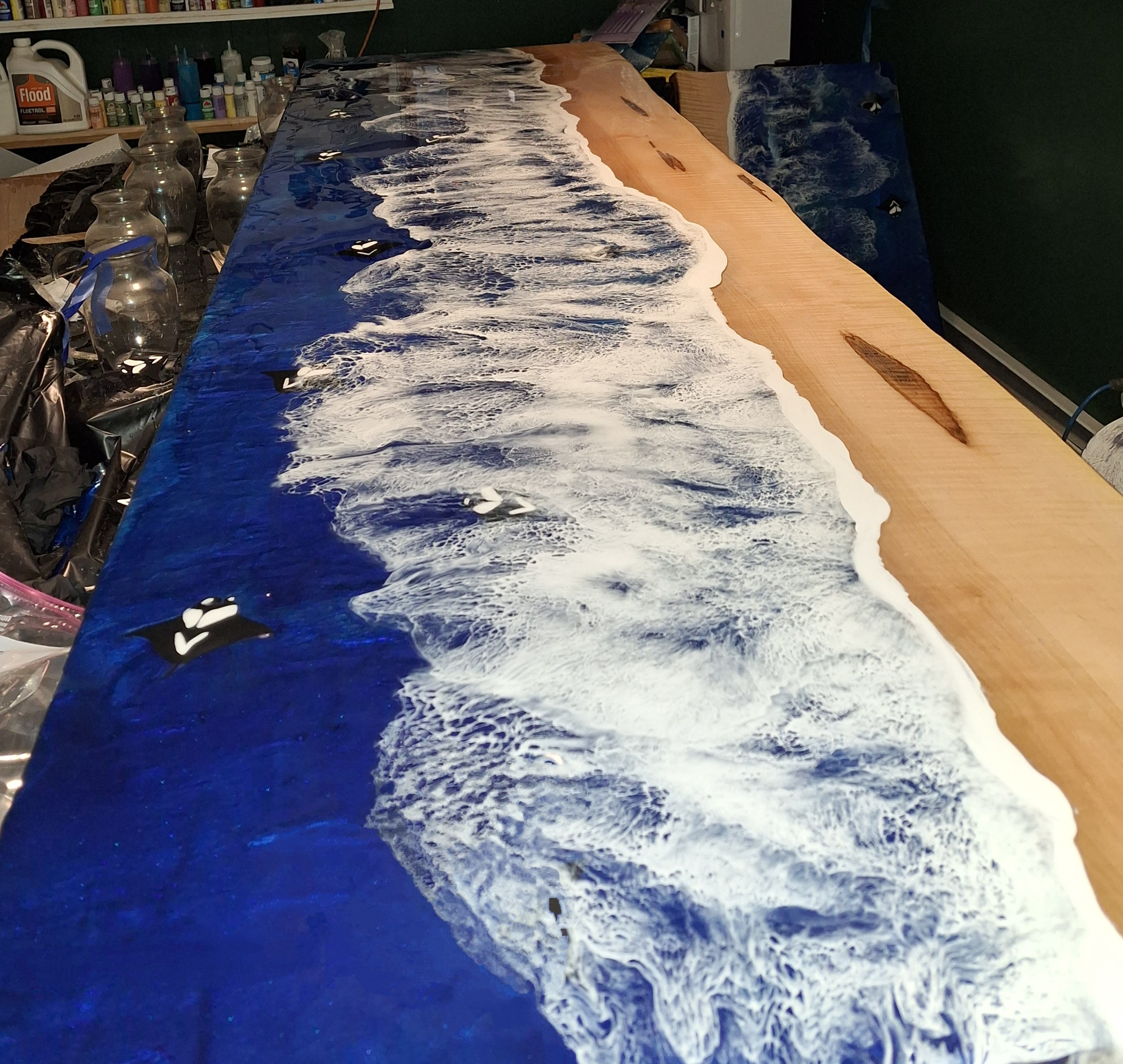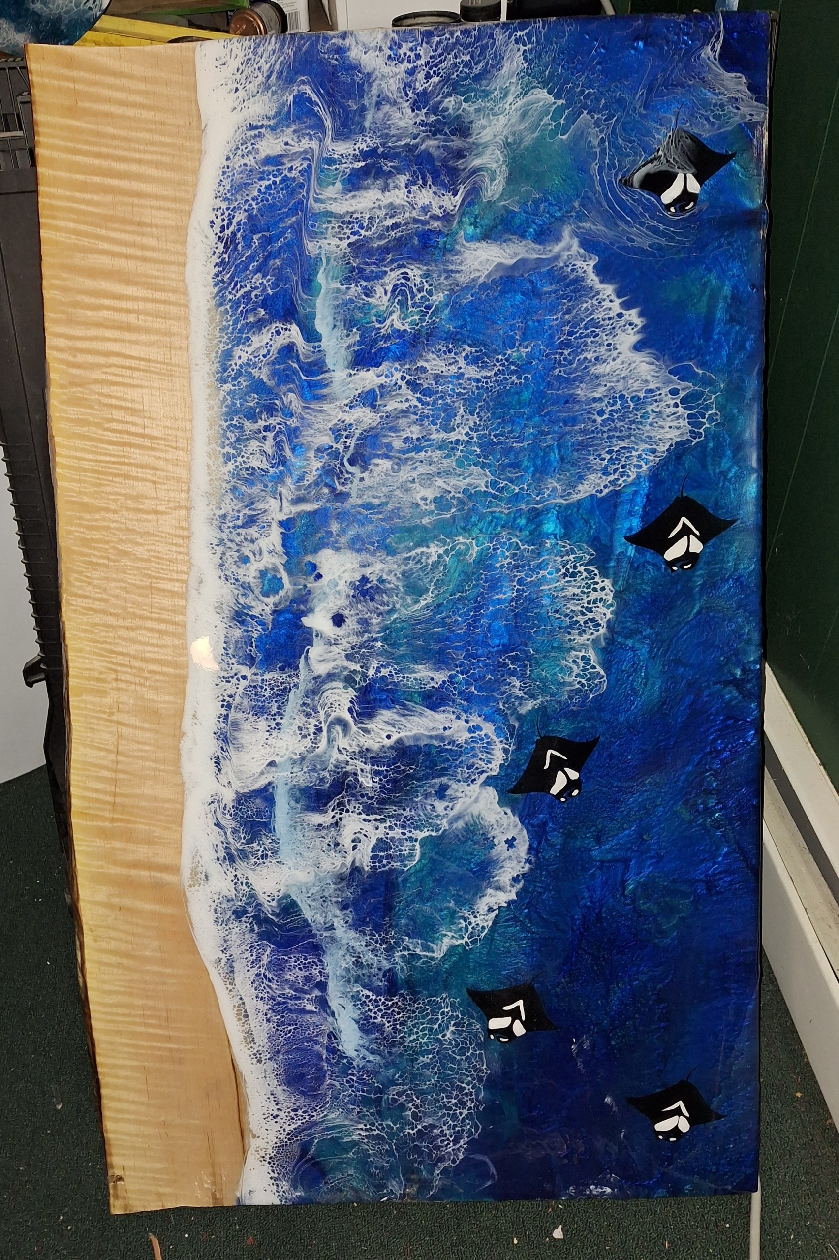 Custom Maple Ocean counter tops with Manta rays in the waves